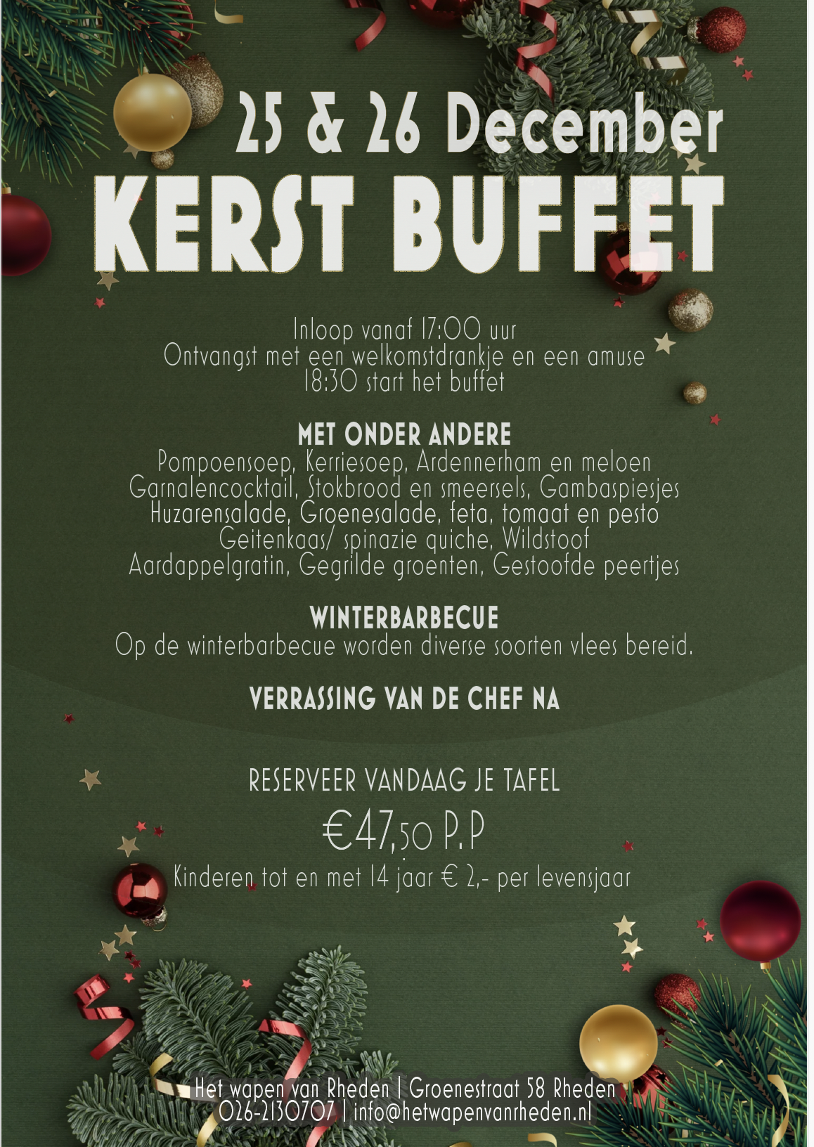 Midden in Rheden, het dorp aan de voet van de Posbank ligt “Het wapen van Rheden” De markante ligging, sfeer en goede service staan garant voor een gezellige avond.